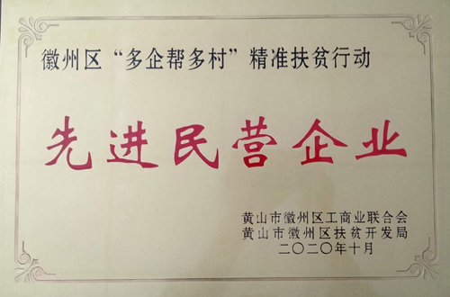2020年10月13日,區(qū)工商聯(lián)、區(qū)扶貧開發(fā)局聯(lián)合在呈坎鎮(zhèn)容溪碼頭農(nóng)產(chǎn)品展銷會上舉行“多企幫多村”精準(zhǔn)扶貧行動先進(jìn)民營企業(yè)表彰大會。包括我公司在內(nèi),徽州區(qū)共有20家企業(yè)獲此殊榮。