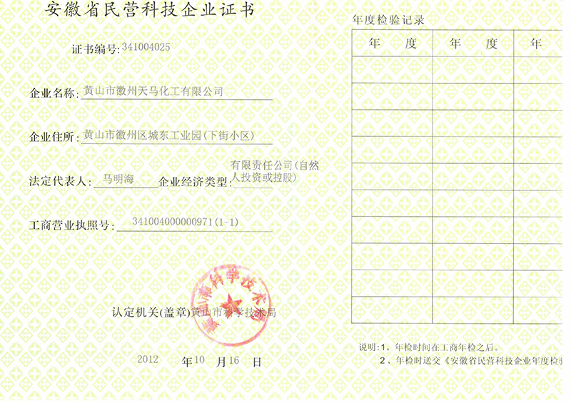 2012年安徽省民營(yíng)科技企業(yè)證書